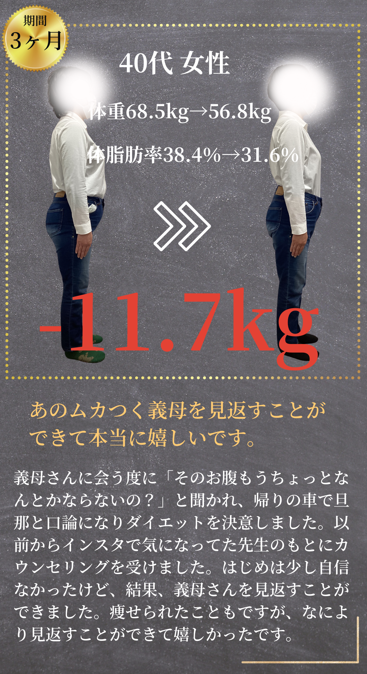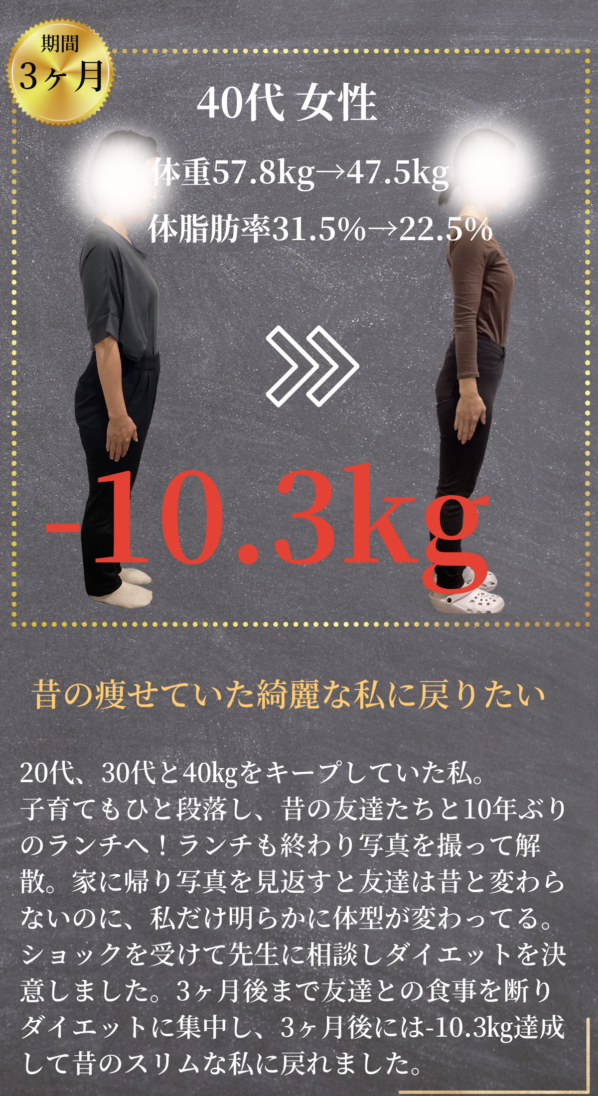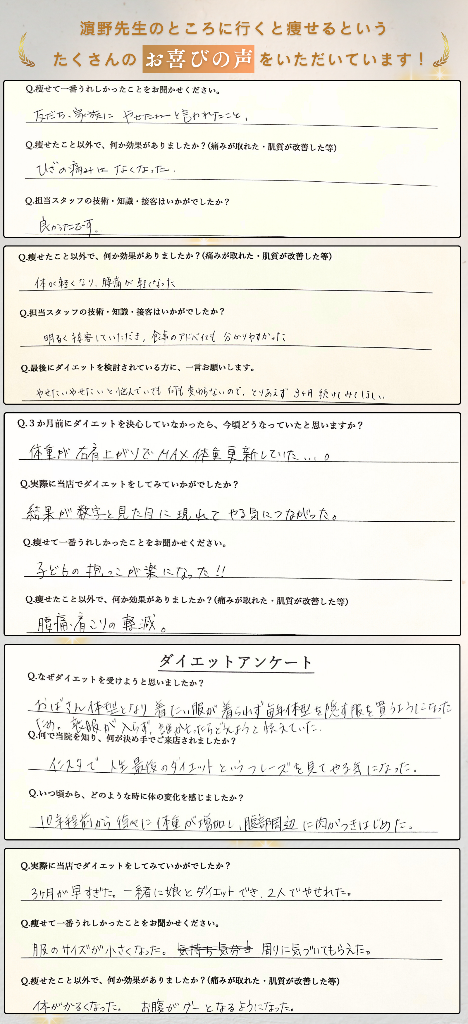 「体が軽くなった」「肌が明るくなった」「自信が戻った」そのような声を日々いただきながら、これまでに100名以上の方が"人生最後のダイエット"を卒業されています。