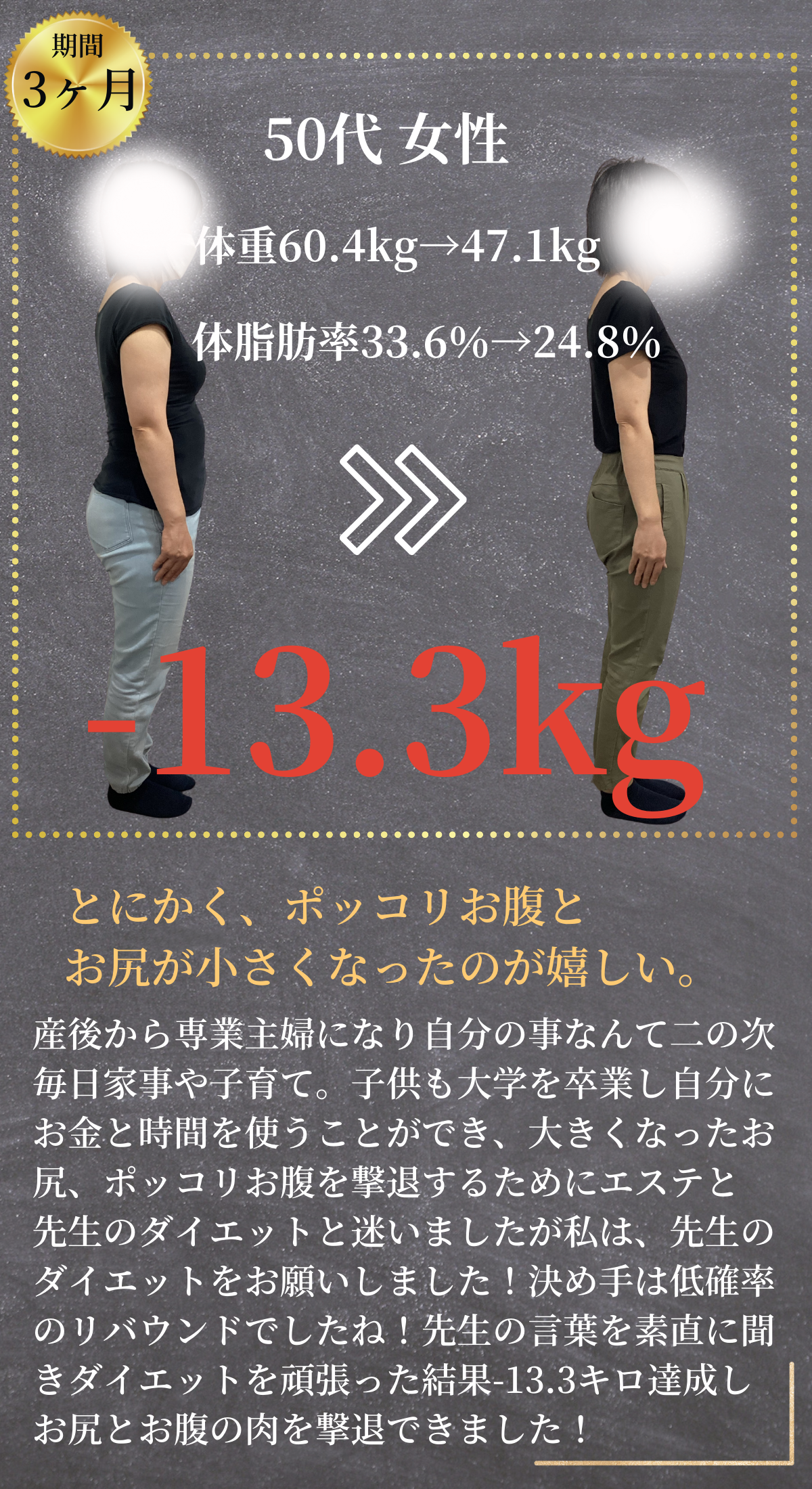 「体が軽くなった」「肌が明るくなった」「自信が戻った」そのような声を日々いただきながら、これまでに100名以上の方が"人生最後のダイエット"を卒業されています。